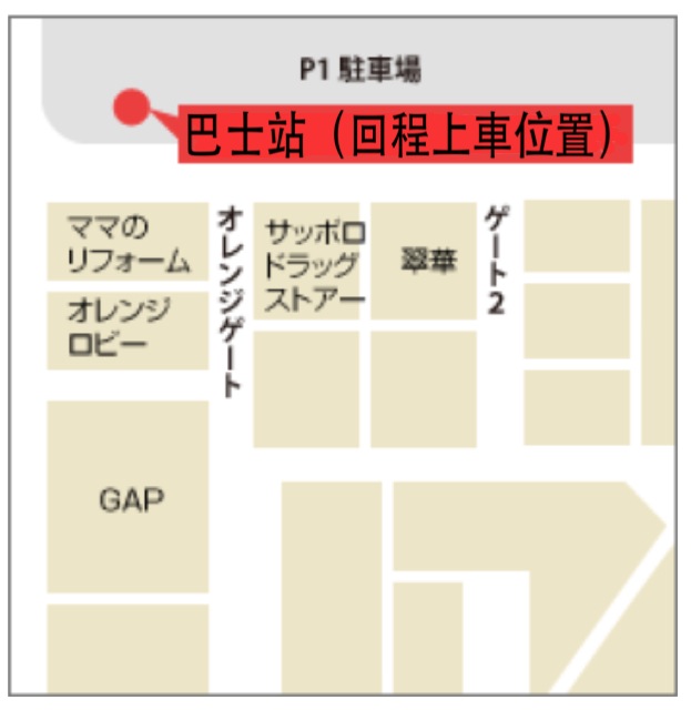 bus stop at Chitose Outlet Mall 7 一月, 2014 623 × 640 免費穿梭巴士往來札幌至千歲Outlet Mall, Rera 回程在千歲Outlet P1停車場側上車